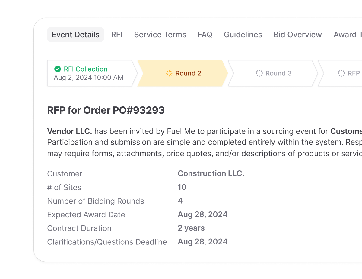 FuelEvent automates RFP creation, bidding, and vendor selection. Use AI-powered workflows to compare quotes, enforce contract terms, and select vendors faster—saving time and money.